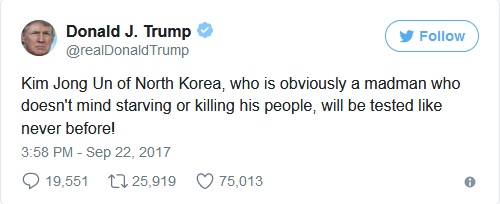 “Kim Jong Un of North Korea, who is obviously a madman who doesn’t mind starving or killing his people, will be tested like never before!” the President tweeted as he added economic sanctions to his fiery military threats against Pyongyang.