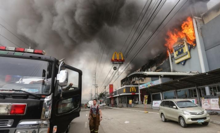 The blaze started at the four-storey NCCC Mall on Saturday morning sending thick plumes of black smoke billowing into the sky over Davao.