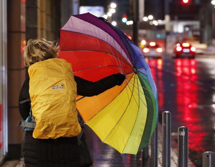 A woman fights with her colorful umbrella as she walks in the city center of Frankfurt, Germany, on a stormy Thursday, Jan. 18, 2018. Heavy storms are forecasted for most parts of Germany on Thursday