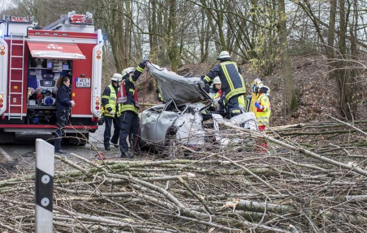 Rescue workers are busy at the site where a car was hit by a falling tree during a storm in Moers, western Germany, Thursday, Jan. 18, 2018. The driver was seriously injured in the accident.