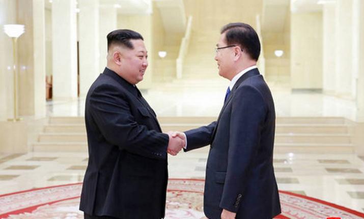 Kim Jong Un shakes hands with South Korean National Security Director Chung Eui-yong in Pyongyang