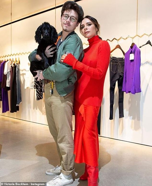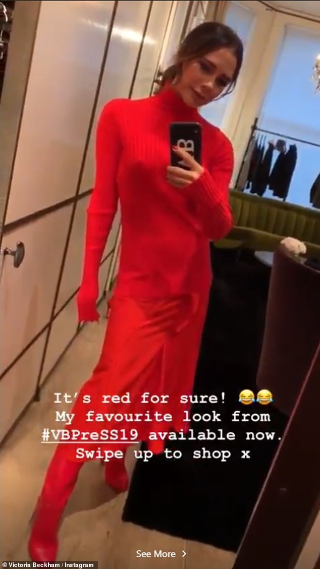 The designer took to Instagram to show off her outfit as she posed inside her shop, writing: 'Had so much fun this morning celebrating the start of the festive season at Harry’s Bar with my clients, wearing my #VBPreSS19 top, skirt and boots. Love this all red look! X'