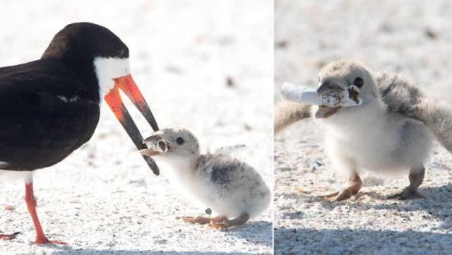 A woman in Florida captured a shocking moment of a black skimmer bird feeding its chick a cigarette butt.