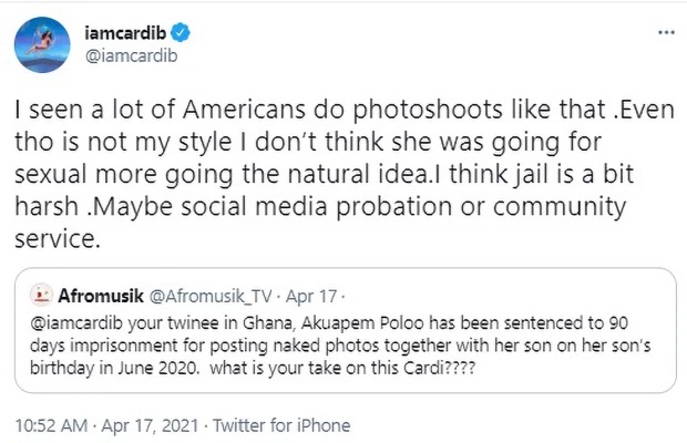 US rap star Cardi B joined international uproar at the "harsh" sentence handed down to Rosemond Brown, better known as Akuapem Poloo.
