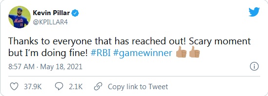 Fortunately, Pillar took to Twitter after the match finished 3-1 to the Mets and reassured his fans and well-wishers.