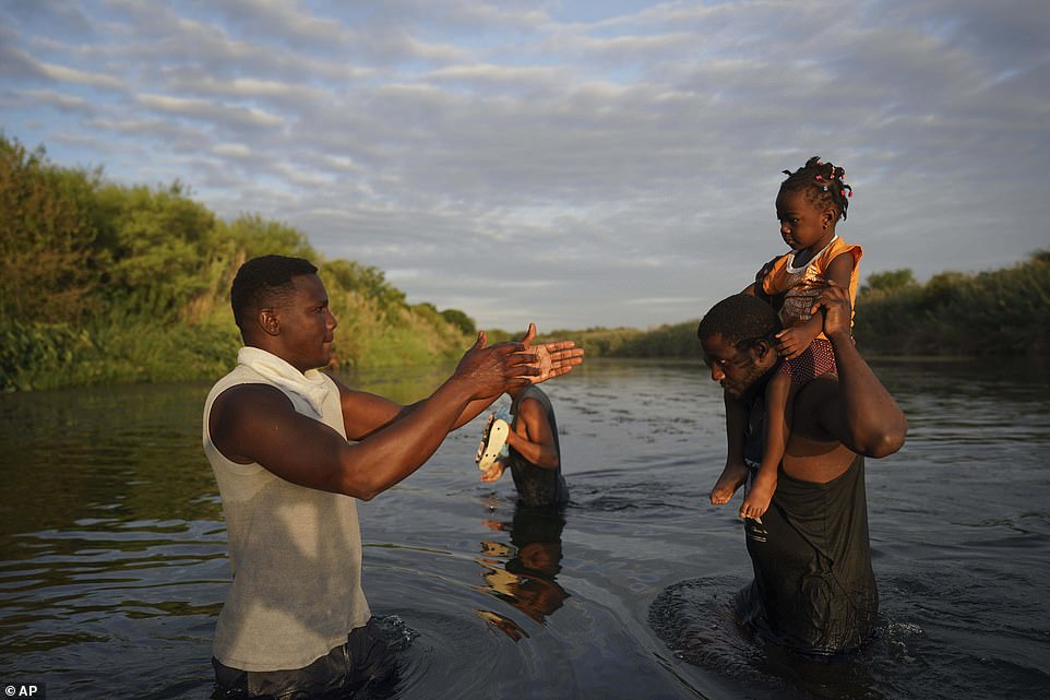 Haitian migrants are pictured on the banks of the Rio Grande in Del Rio, Texas, after crossing from Mexico into the US