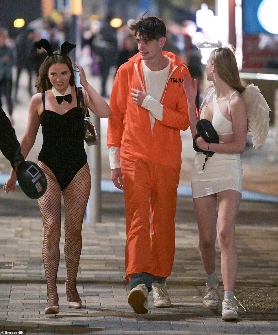 Thousands of revellers took to the streets of Birmingham for the beginning of Halloween weekend last night. Pictured: A would-be escaped convict in an orange jumpsuit is flanked by a woman dressed all in white with angel wings and a halo while on his right is a woman in a Playboy outfit of bunny ears and black sheer-to-waist fishnet stockings with a bow tie