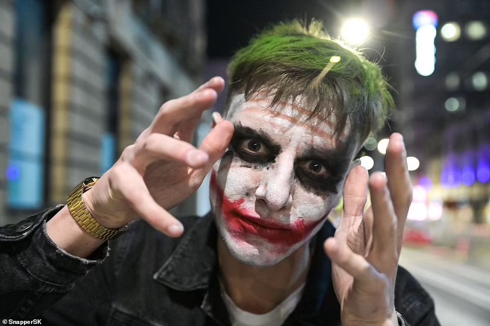 One man lathered on the face paint to look like the Joker from the hit franchise Batman with a set of wide red scars stretching ear to ear