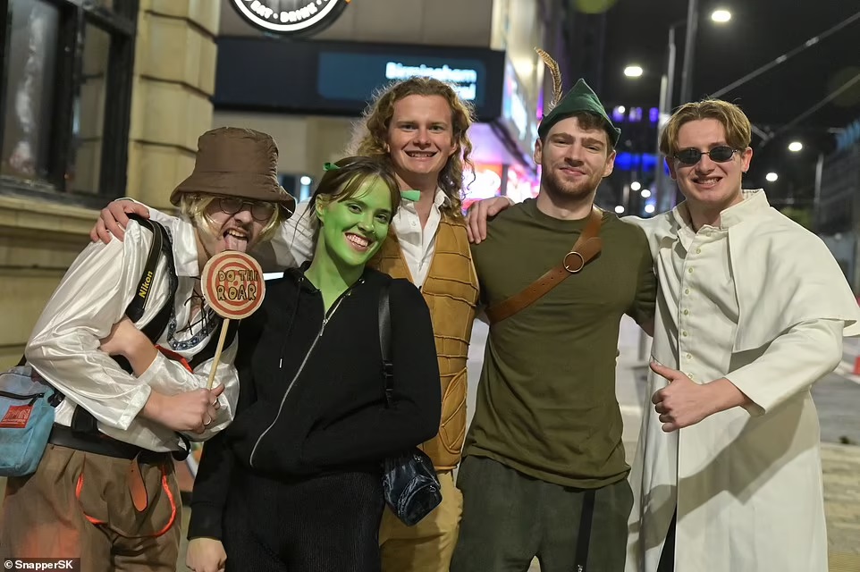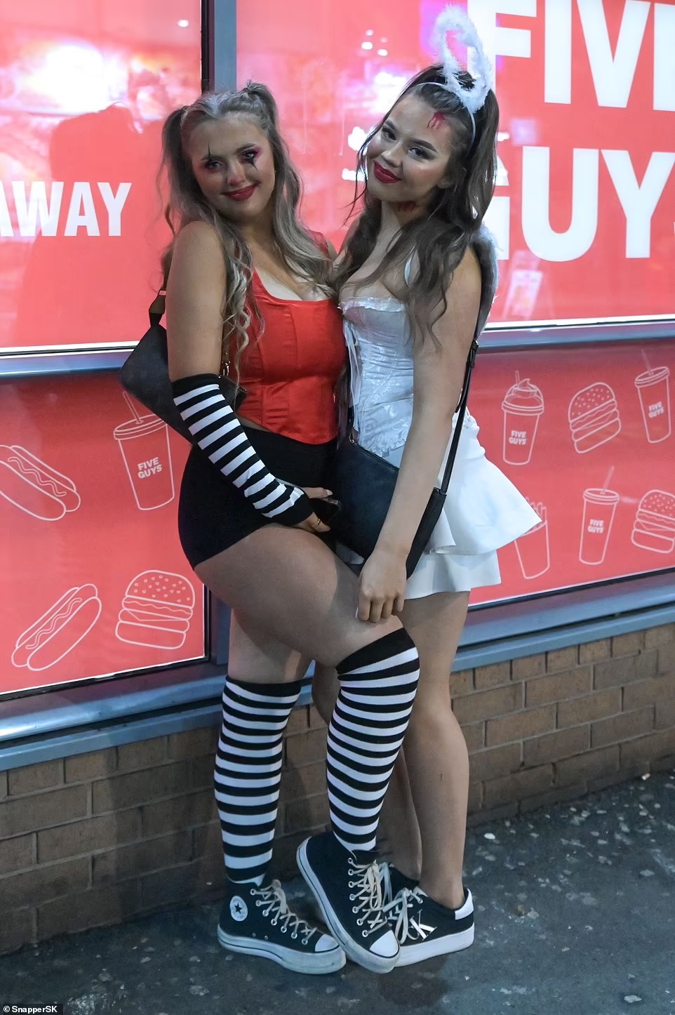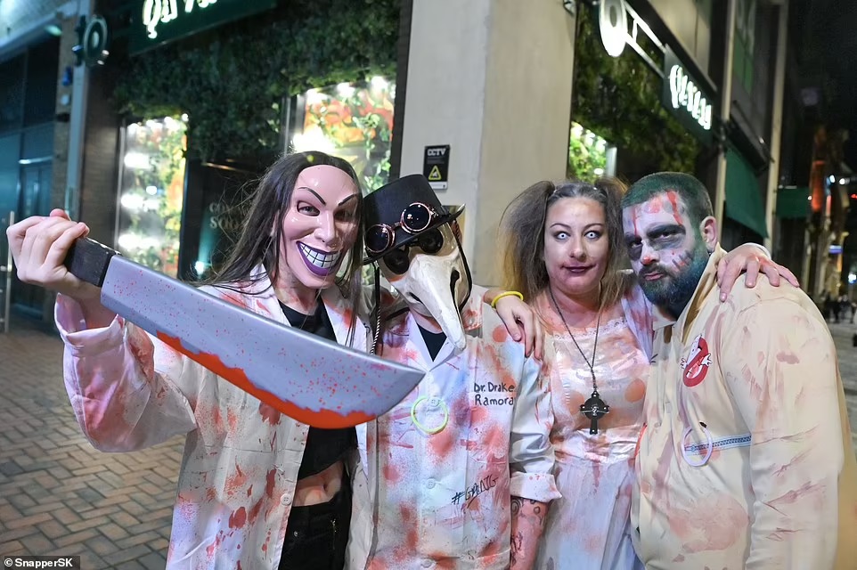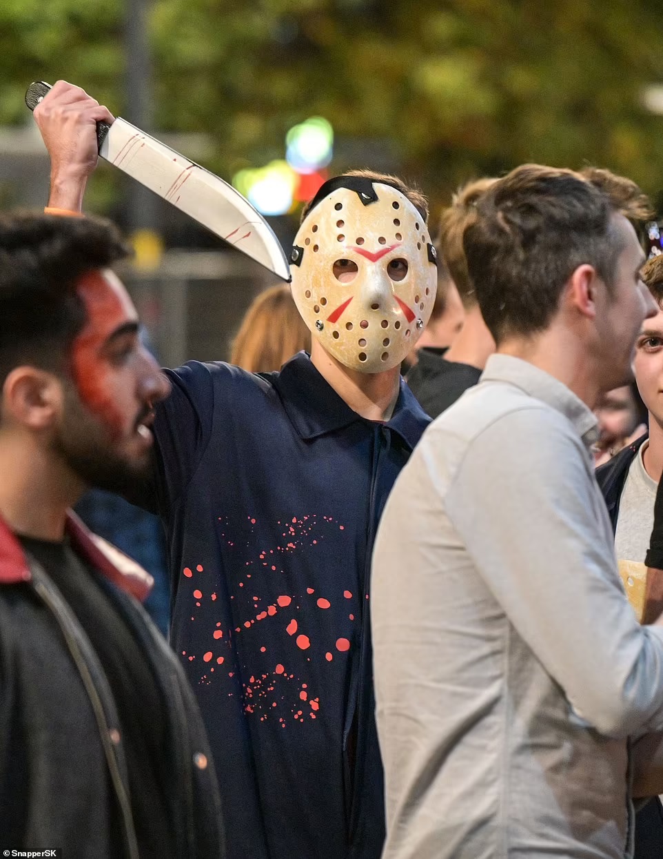 Revellers on Broad Street, Birmingham, were in particularly extravagant costumes, from creepy clowns and Friday the 13th killers to skimpily-clad Playboy bunnies.