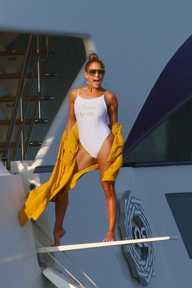 Actress Jennifer Lopez is thigh and dry as she poses in a “forever young” swimsuit. The mum of two, 50, was on a luxury yacht while holidaying with fiance Alex Rodriguez..