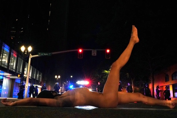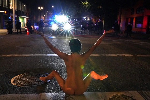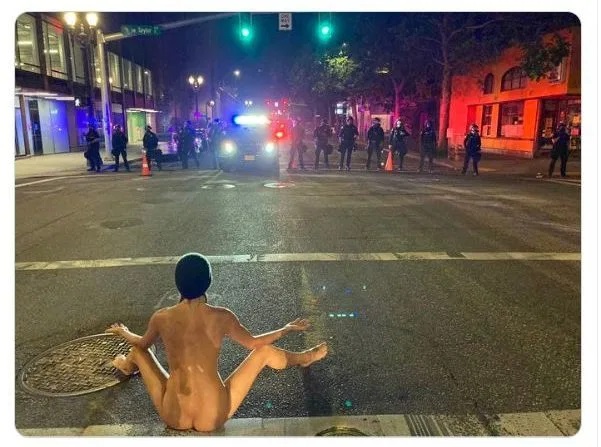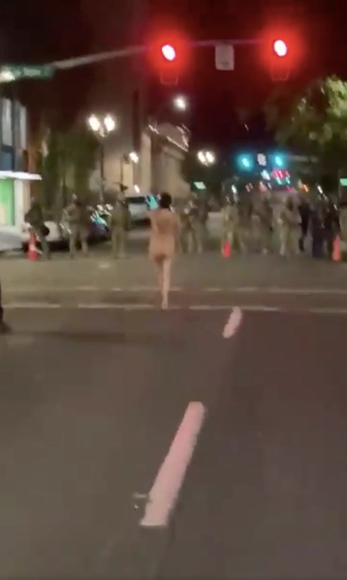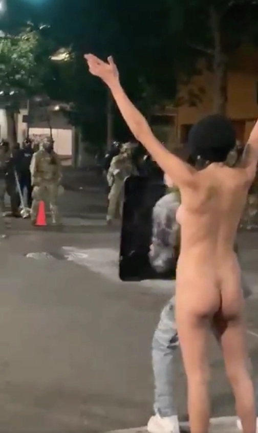 A protester in Portland put on a stark display in front of cops as she sat with her legs apart on Friday night.