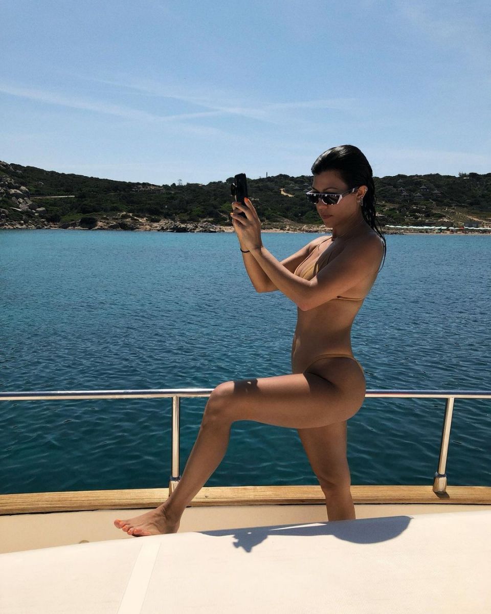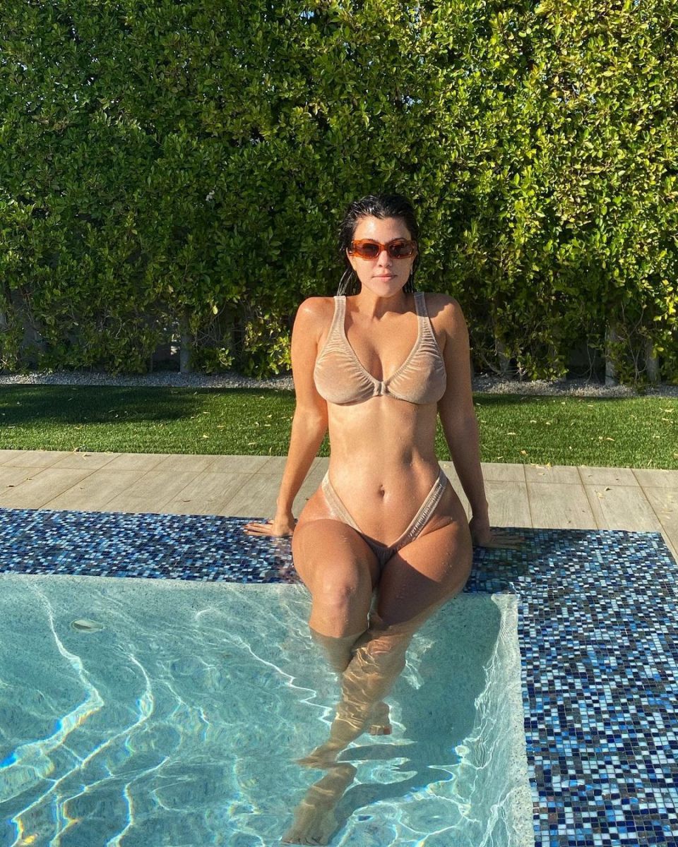 Kourtney flaunts her toned body in a nude bikini. (Image: Instagram)